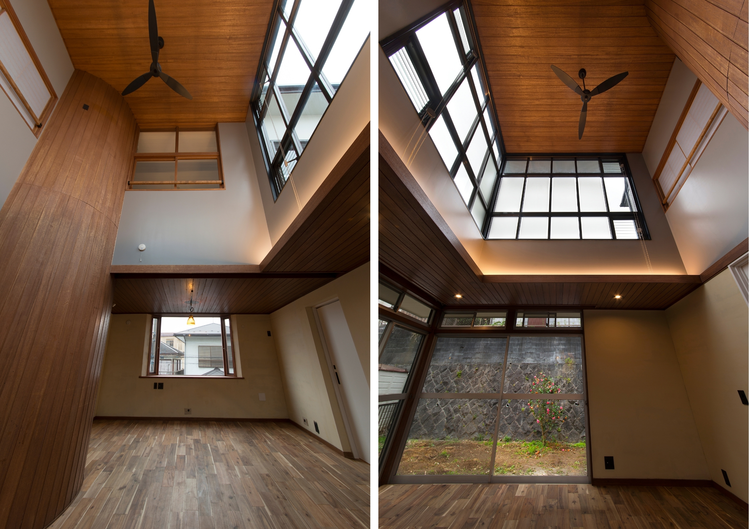 吹き抜けを設けることで、壁に面した窓だけでなく、2階部分に設けた**高窓(ハイサイドライト)**から効率よく自然光を取り込むことができます。