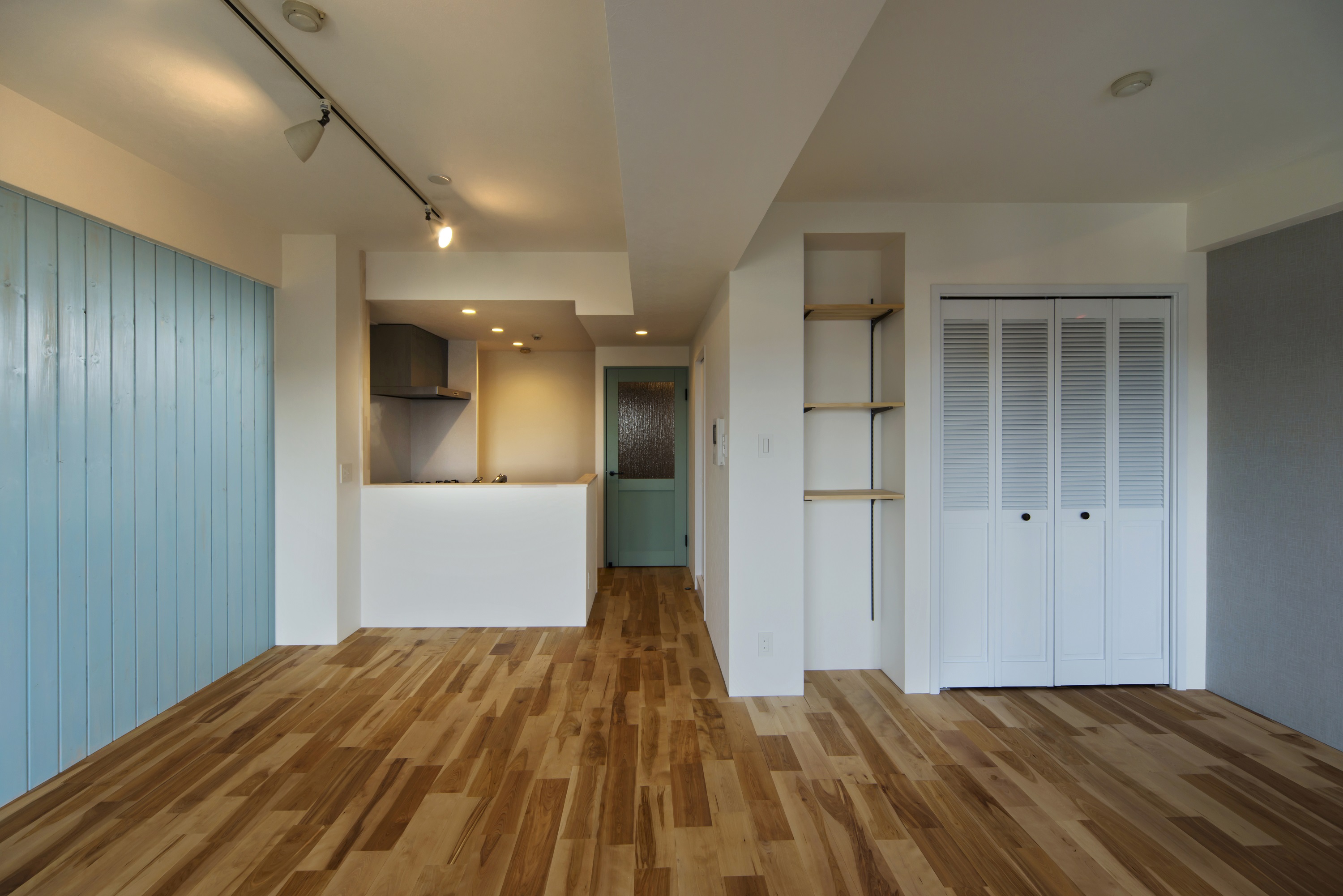 パステルブルーの木材パネリングが彩る、やさしいリビング空間