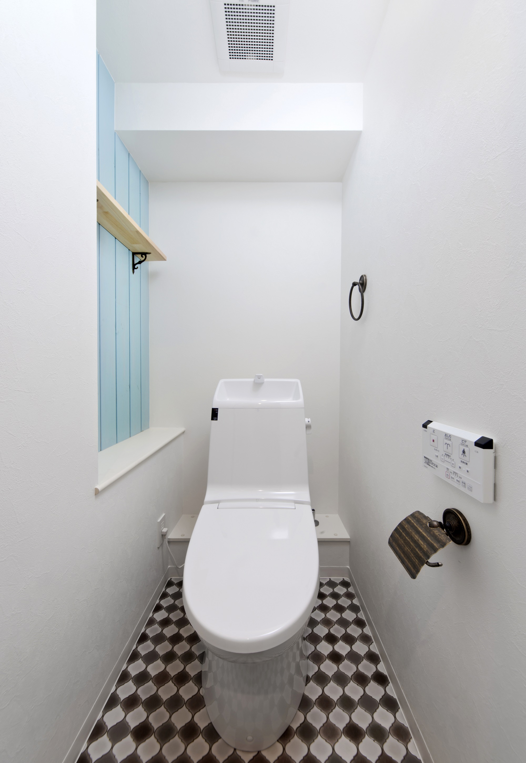 玄関にはモザイクタイルで表情を加え、水まわりにはターコイズブルーを取り入れる。
