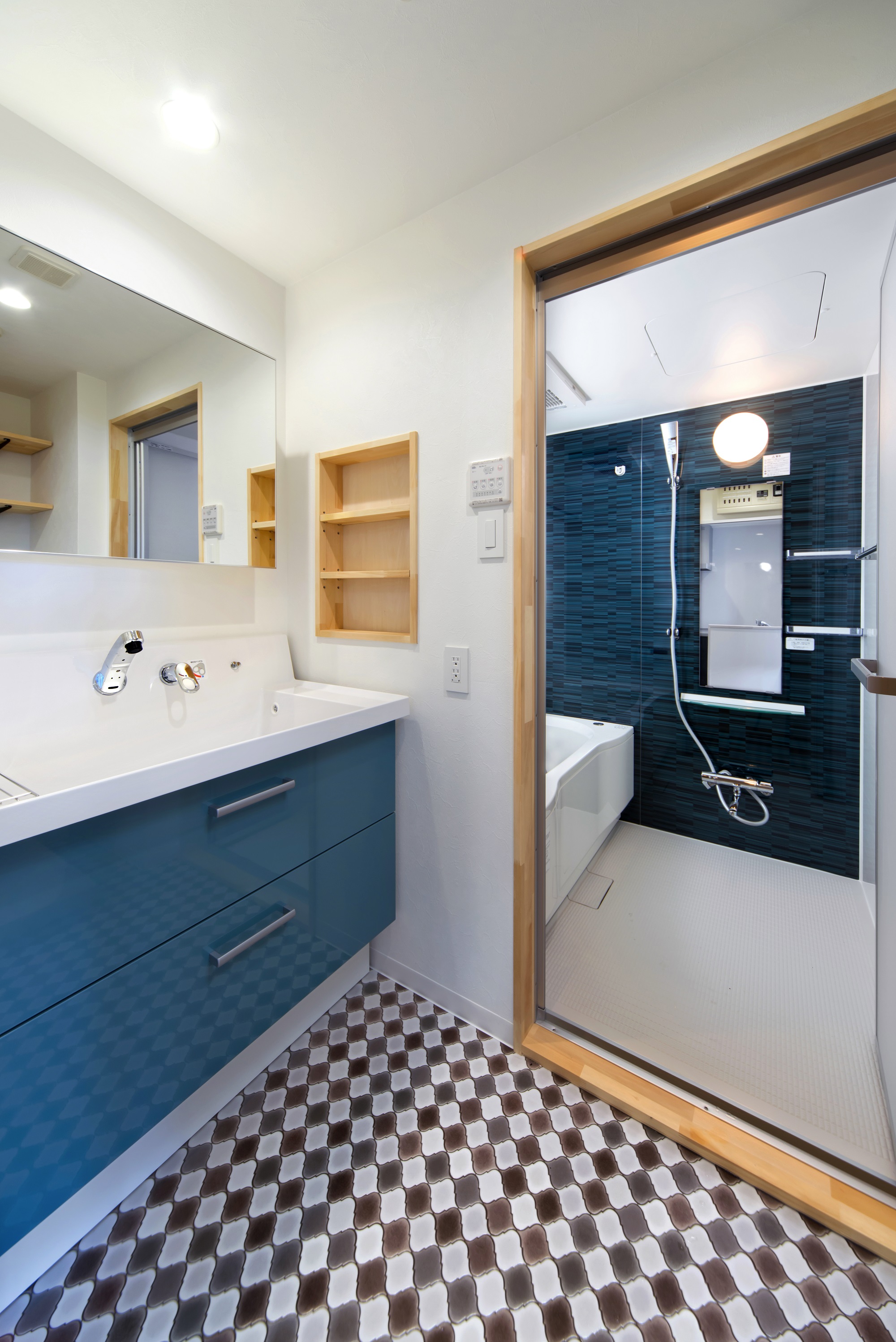 洗面台の全面パネルや浴室壁には、ブルー系の色味を採用。