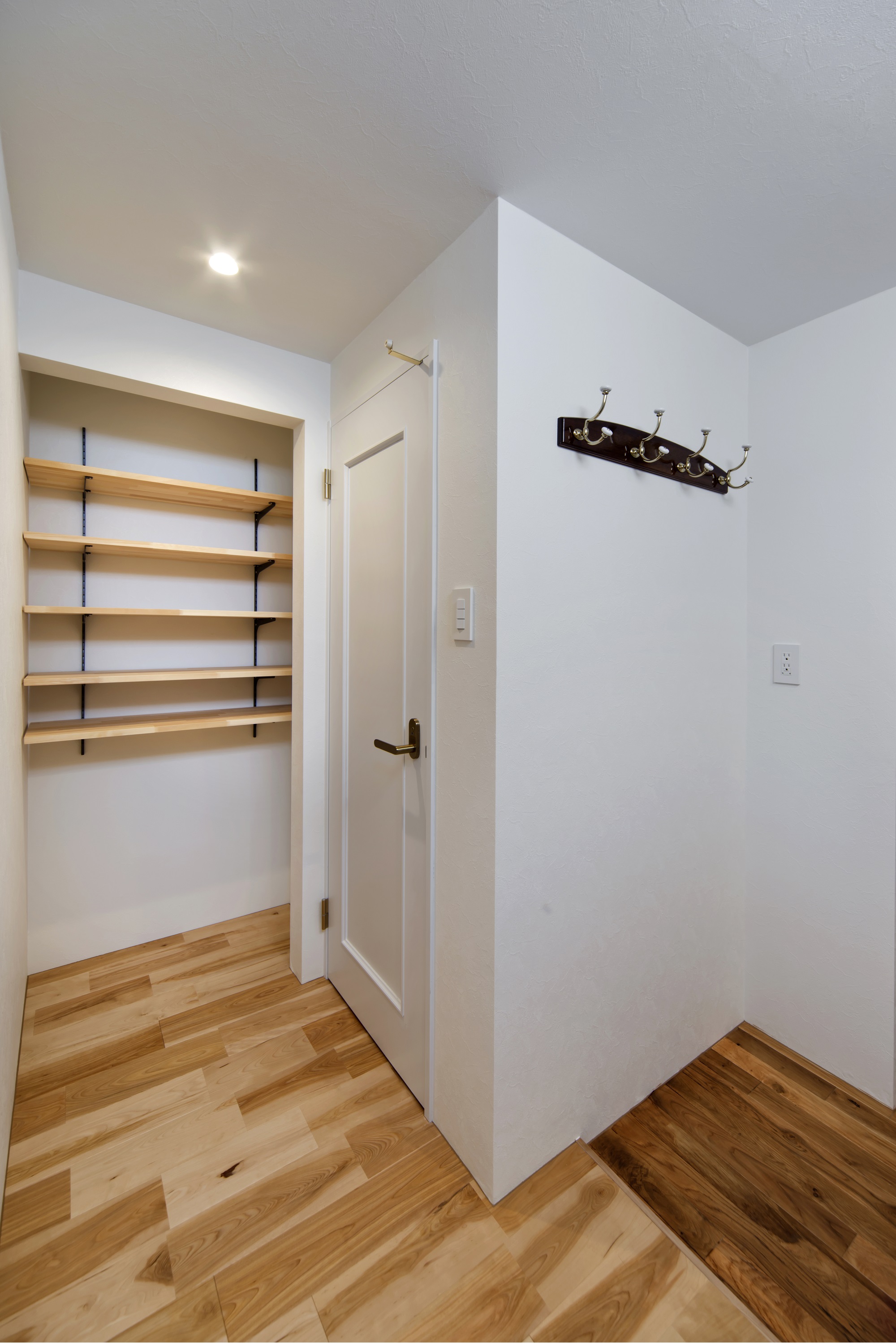 玄関まわりには、コートやバッグを掛けられるフックを設置し、靴の収納にも困らない収納スペースを確保しました。
