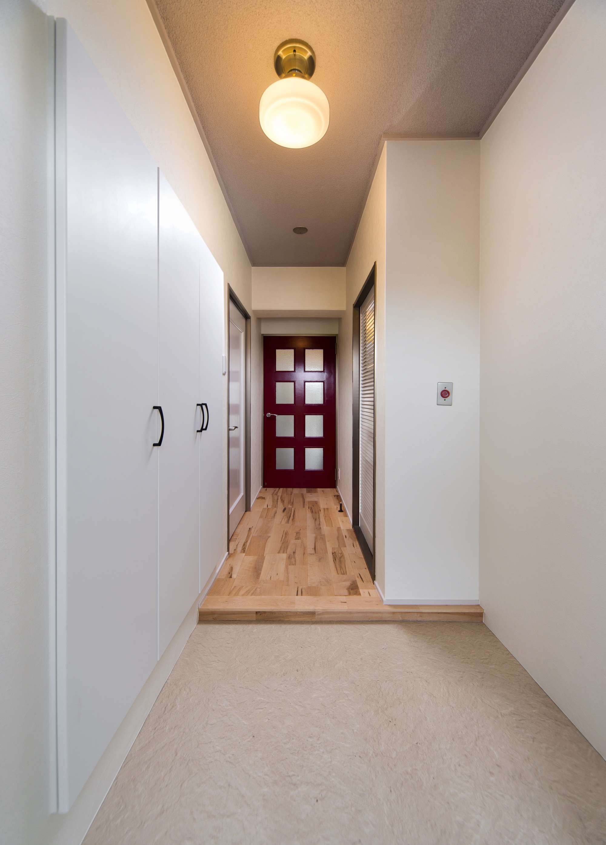 リビングのアクセントとなるのは、深い赤色のガラスを組み込んだ格子デザインの扉。