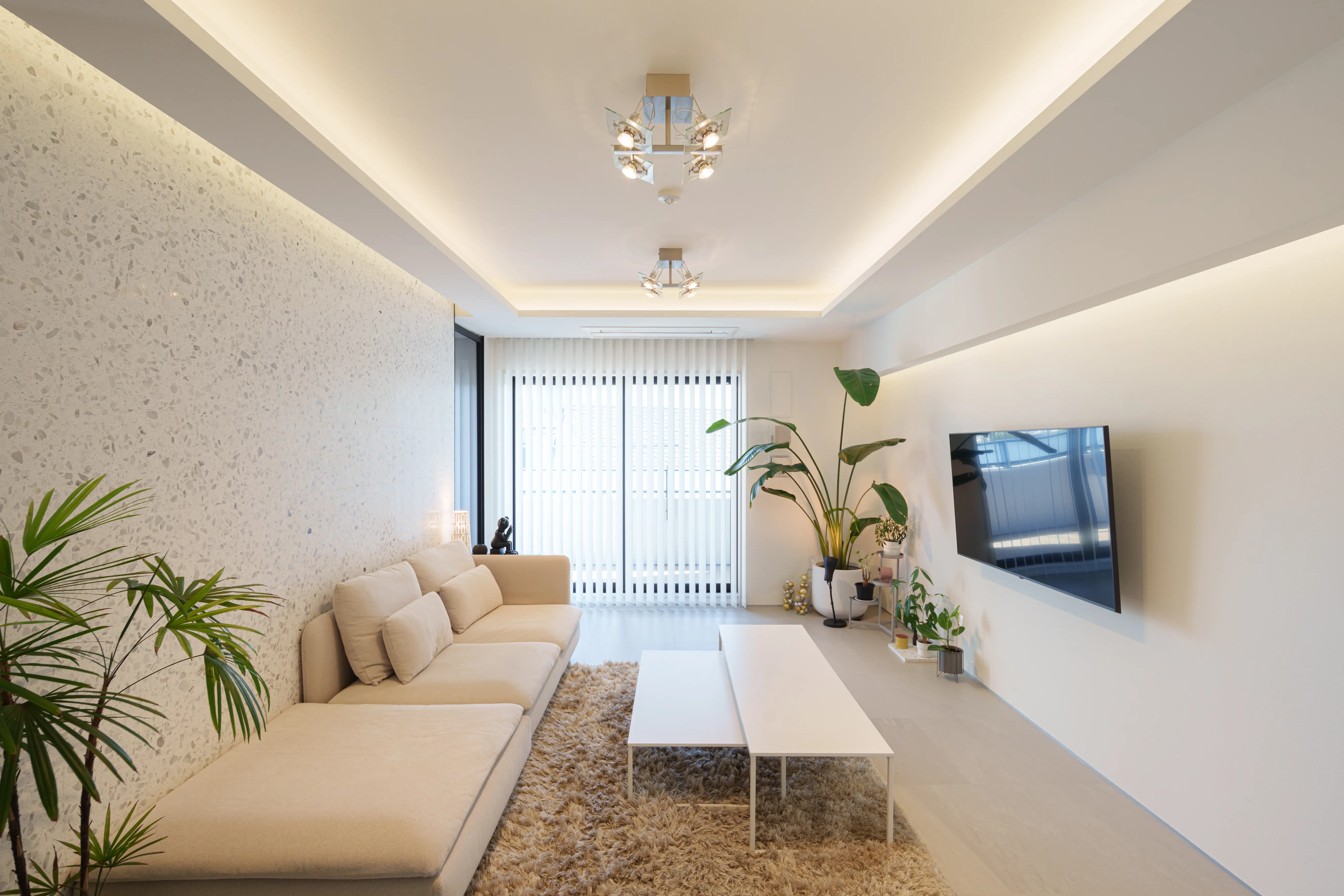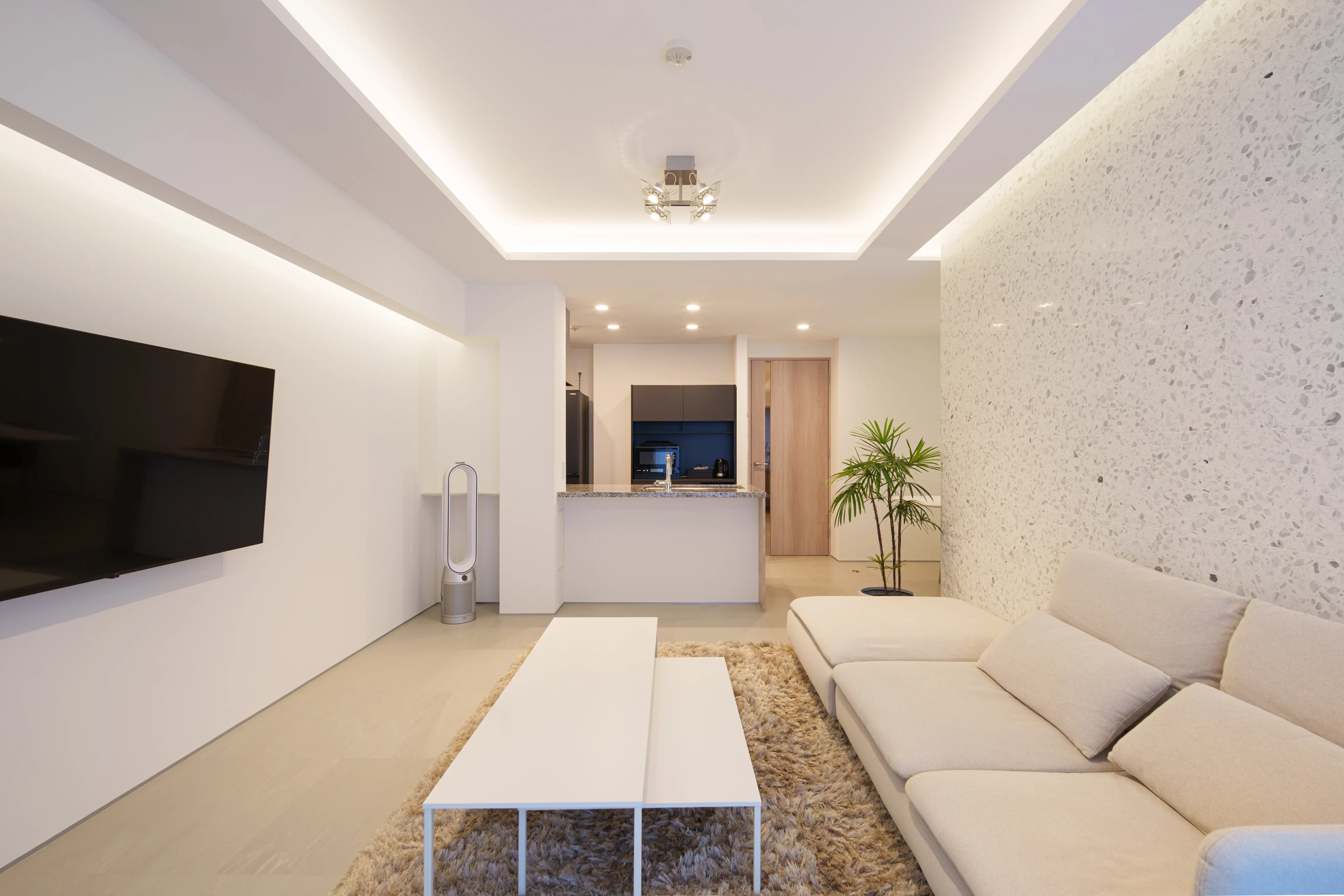 今回は「コーブ照明+コーニス照明」のダブル間接照明の計画で、天井と壁の両方の面を照らして明るさを確保したことで、ダウンライトや他照明器具を最小限かつ低い照度でも空間を明るく保つことができるようになりました。
