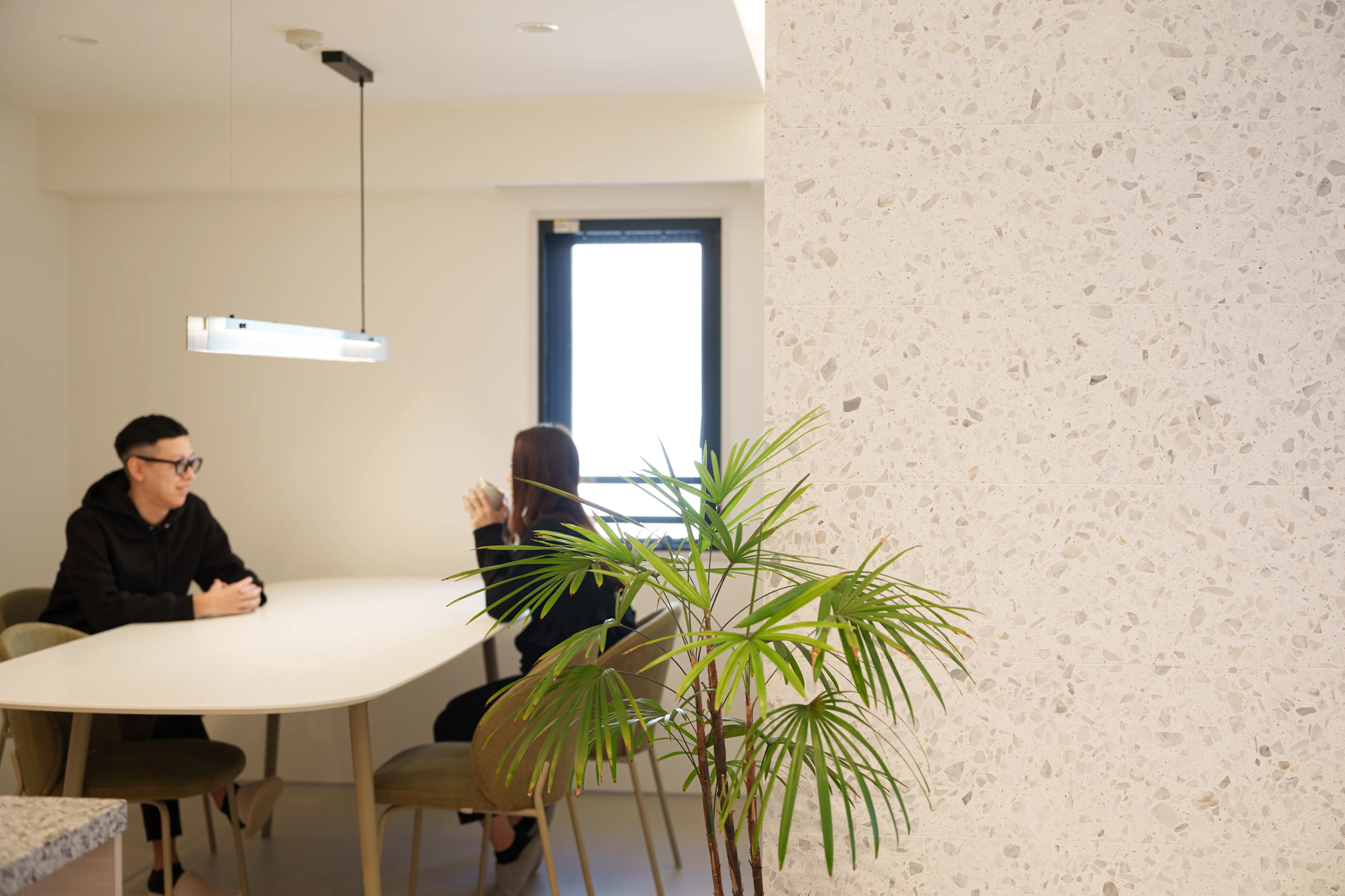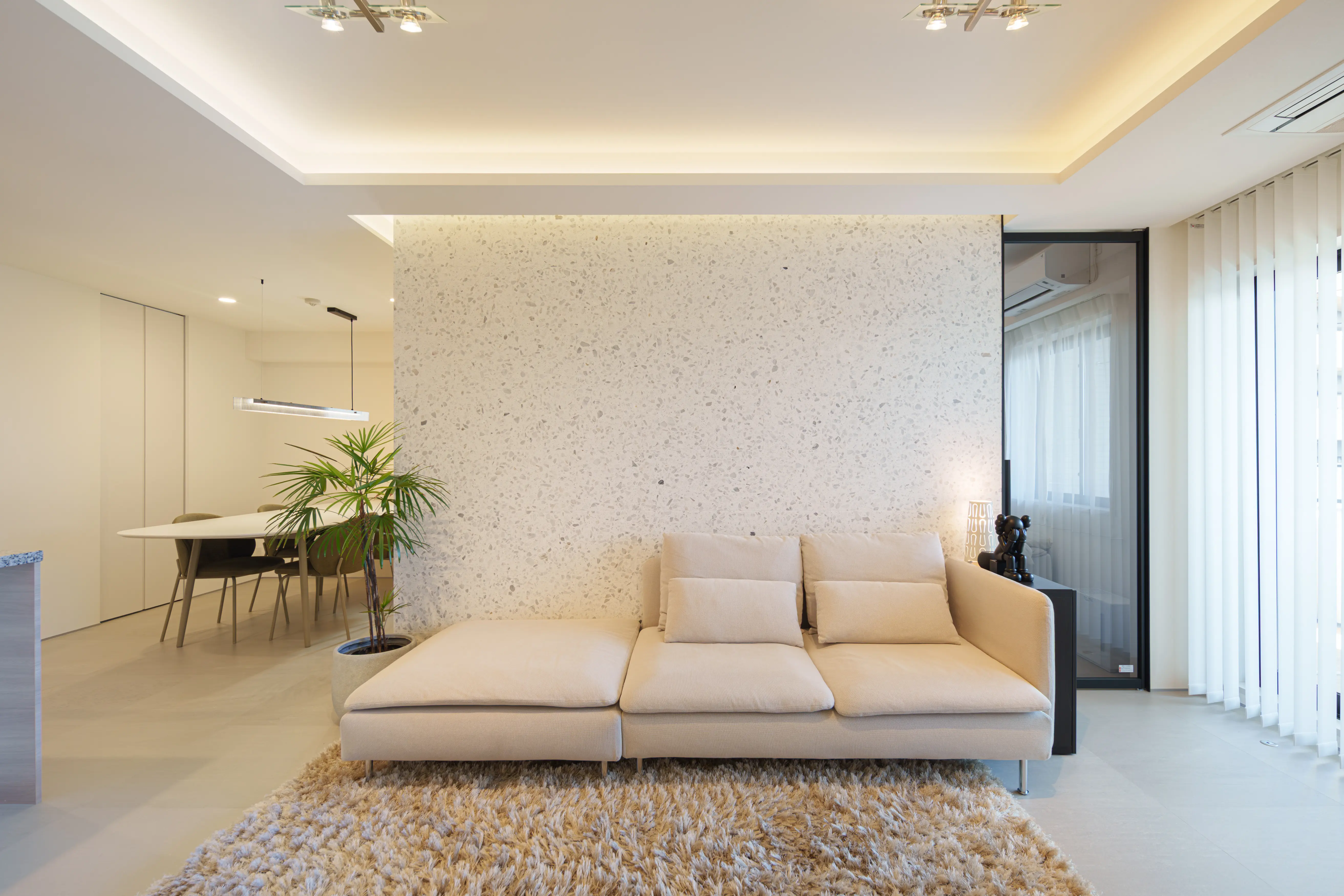 天然や本物志向の傾向が強まっている昨今では、リアルな素材感がデザインにおいて大きな役割を果たします。鏡面仕上げで高級感を感じながらも、落ち着いたオフホワイトに、ホワイトベースの骨材で派手過ぎない自然で不規則な模様が個性も感じさせます。