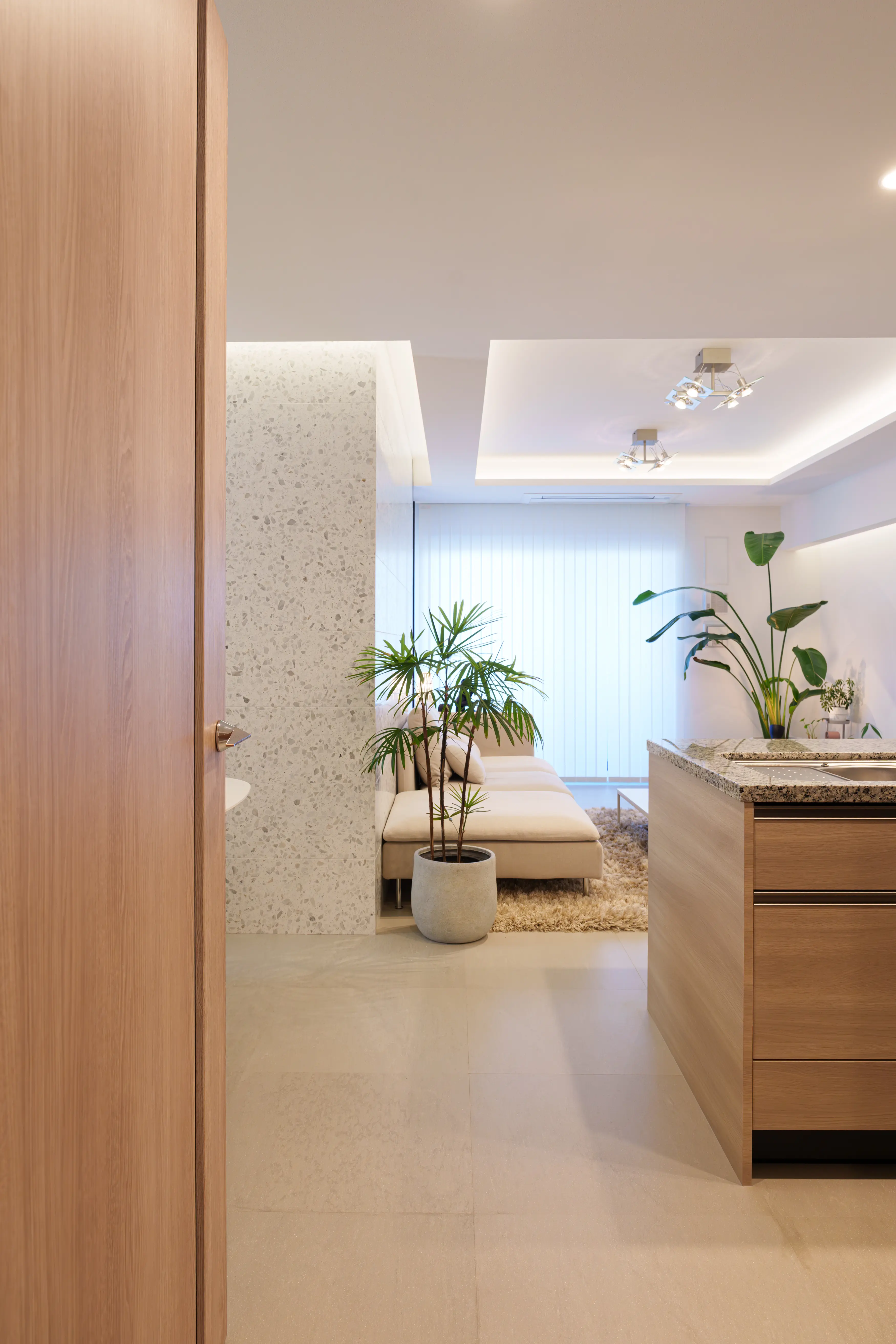 リビングドアを開けると真っ先に視界に飛び込んでくるのが、L字型に貼られた天然石のテラゾータイルです。(テラゾータイルとは、砕いた石やガラス等の骨材をセメントや樹脂で固めて表面を研磨した人造大理石タイルです。)