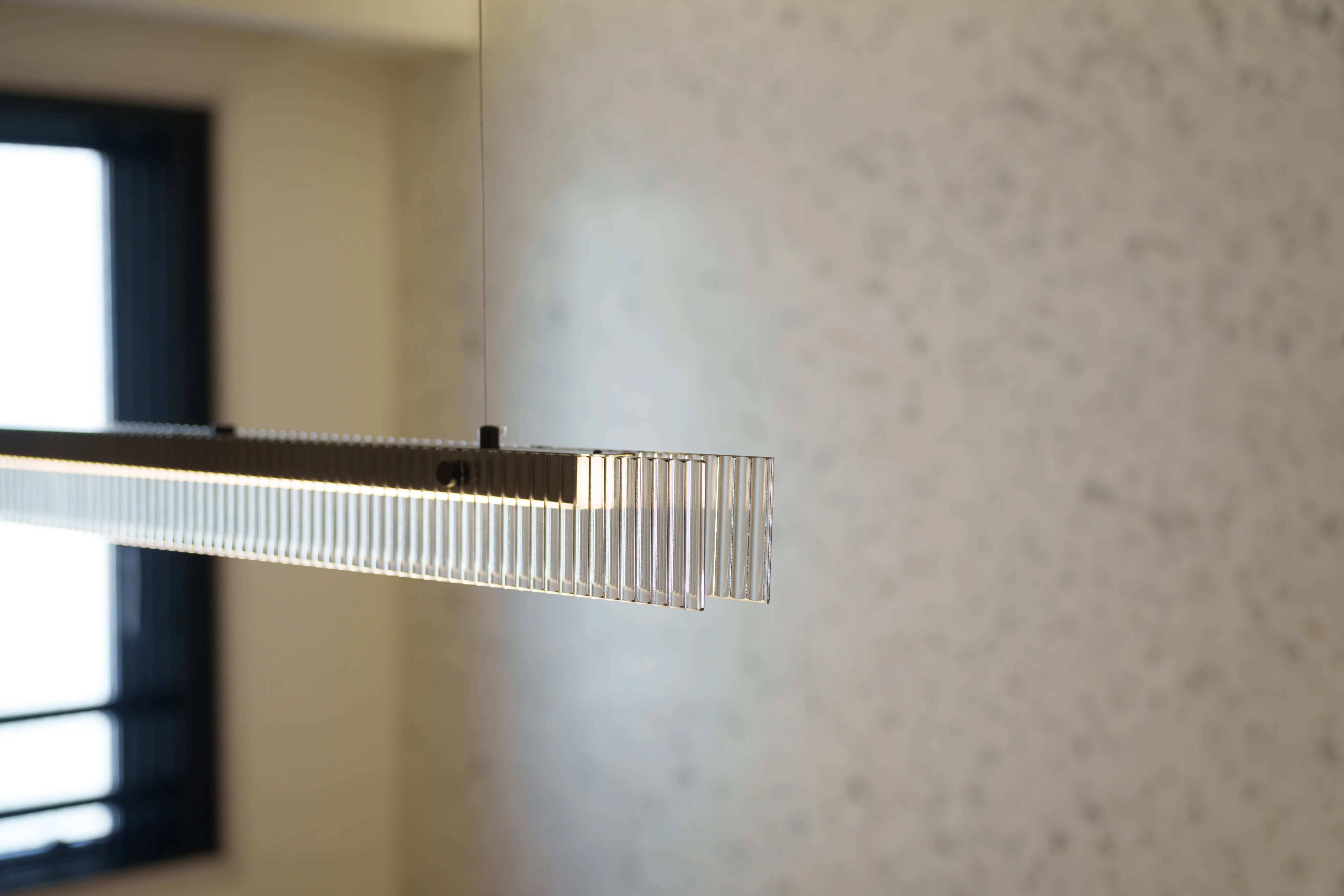 海外製のこだわりのライン照明は無駄のないデザインで主張は強くないものの、寂しさも感じさせない存在感があります。ワイドの大きなダイニングテーブルにぴったりの立派なサイズ感が特徴的です。
