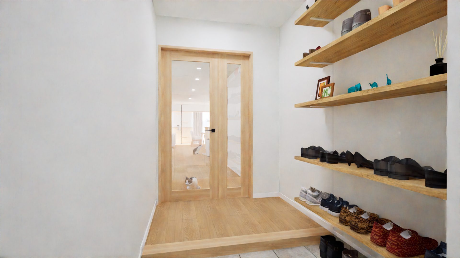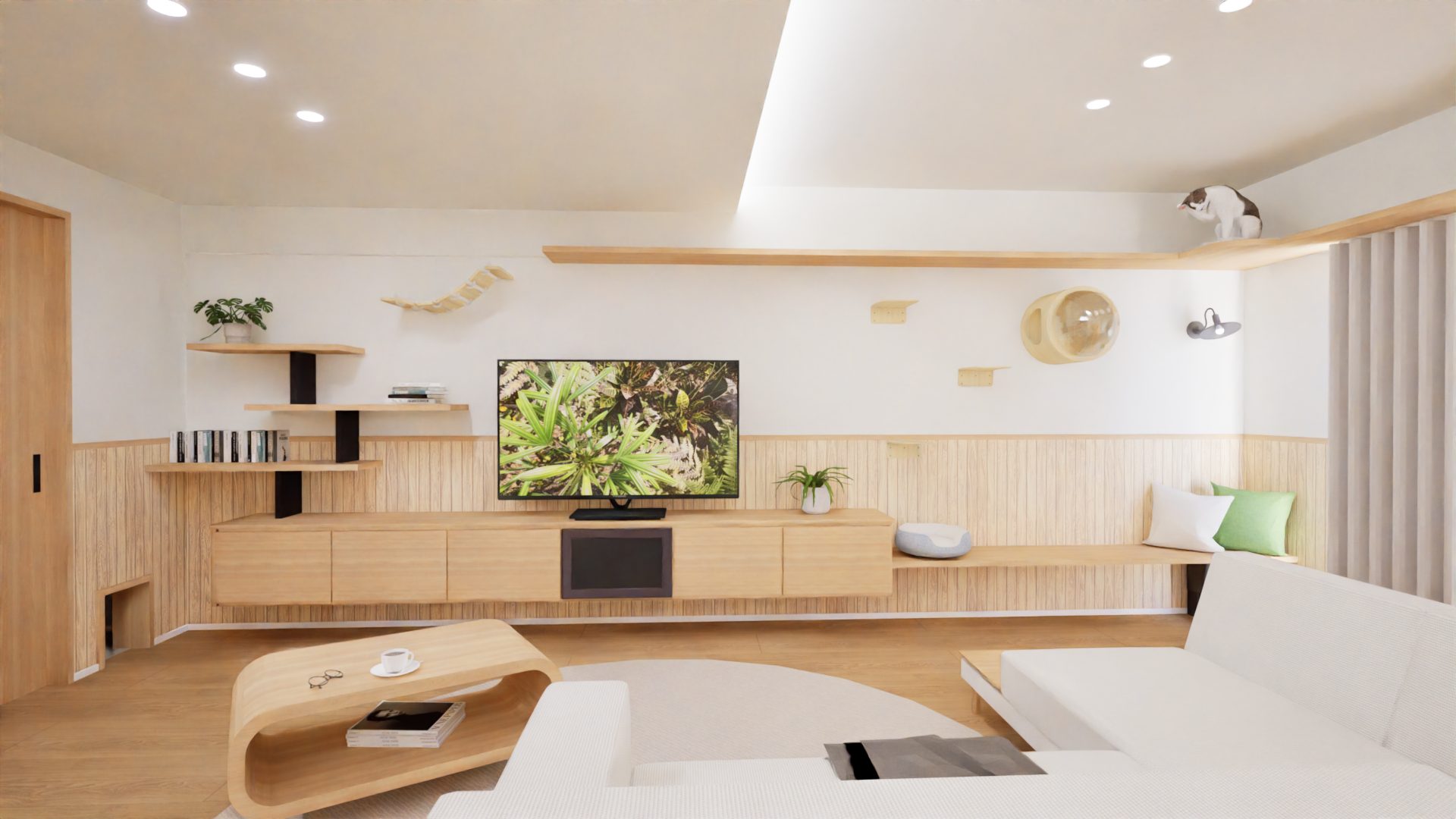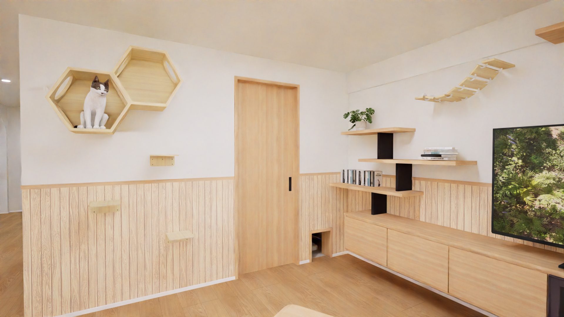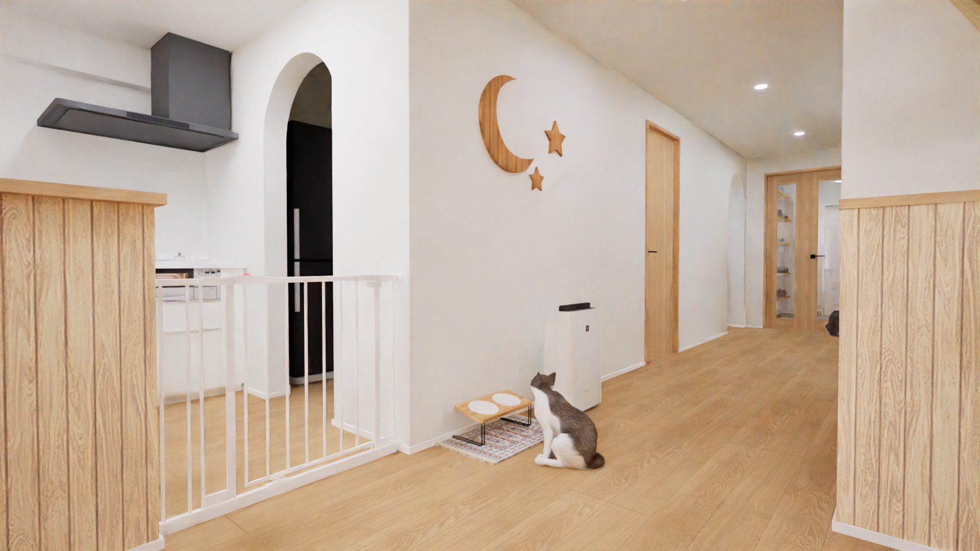 まず、家の中で自由に動き回れることを重視しました。そのため、リビングの上空を自由に回遊できるキャットウォークはもちろんのこと、2方向から上がれるキャットステップや、休憩場所を各所に用意しました。さらに、より広々と過ごすことができるように廊下の面積を最小限に。リビング扉もガラスにしたので、帰宅時に真っ先に猫ちゃんの様子を確認することができます。🐈