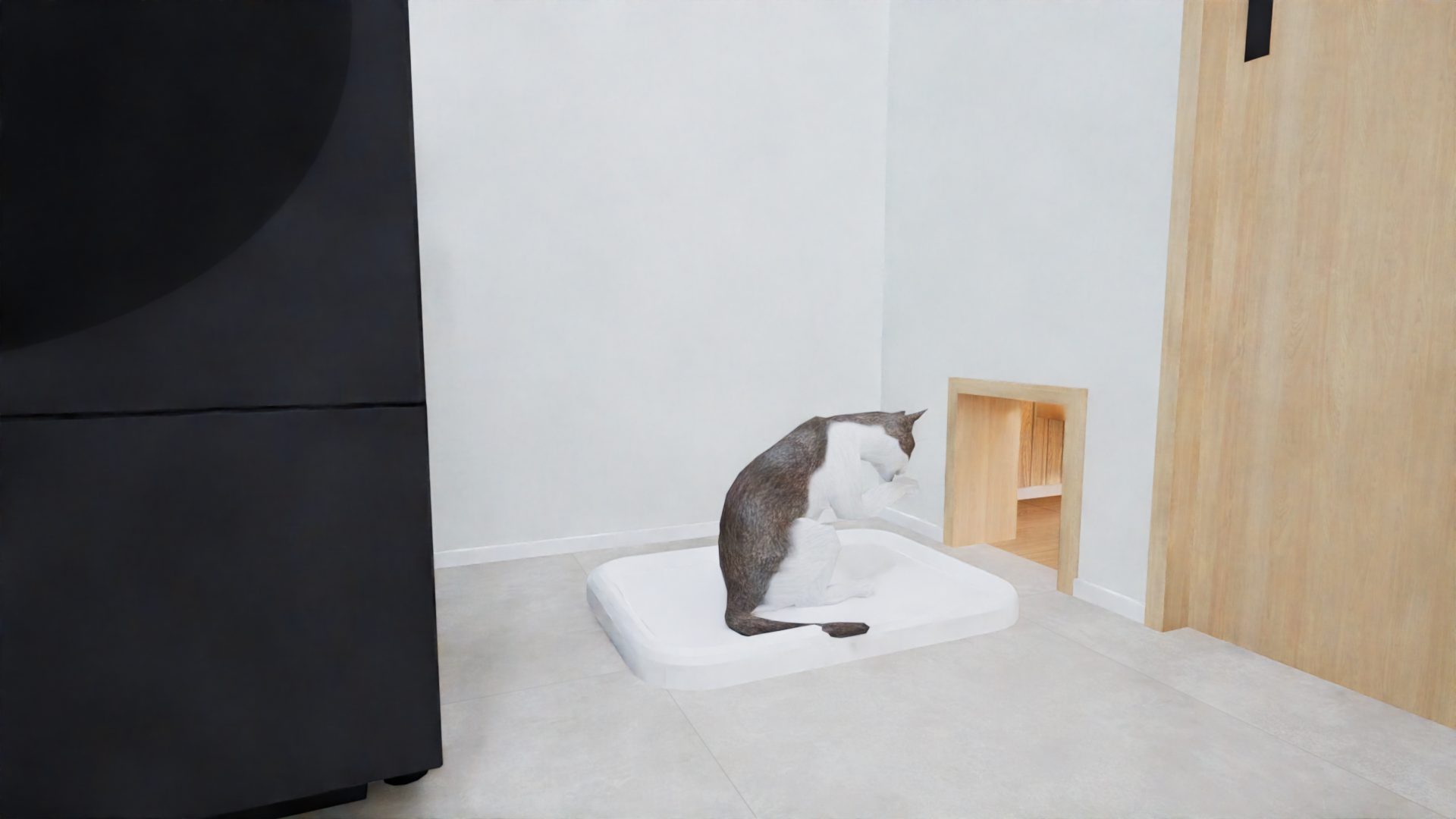 猫用の小窓をくぐると脱衣室に繋がっており、そこでトイレを済ませることでリビング全体への臭気の充満を未然に防ぎます。意匠的にもトイレを置くことには少し抵抗を感じますよね。見えない、匂わないを意識しました。脱衣室ということもあり、万が一汚れが発生した場合でもすぐに洗浄することができます!.。o○